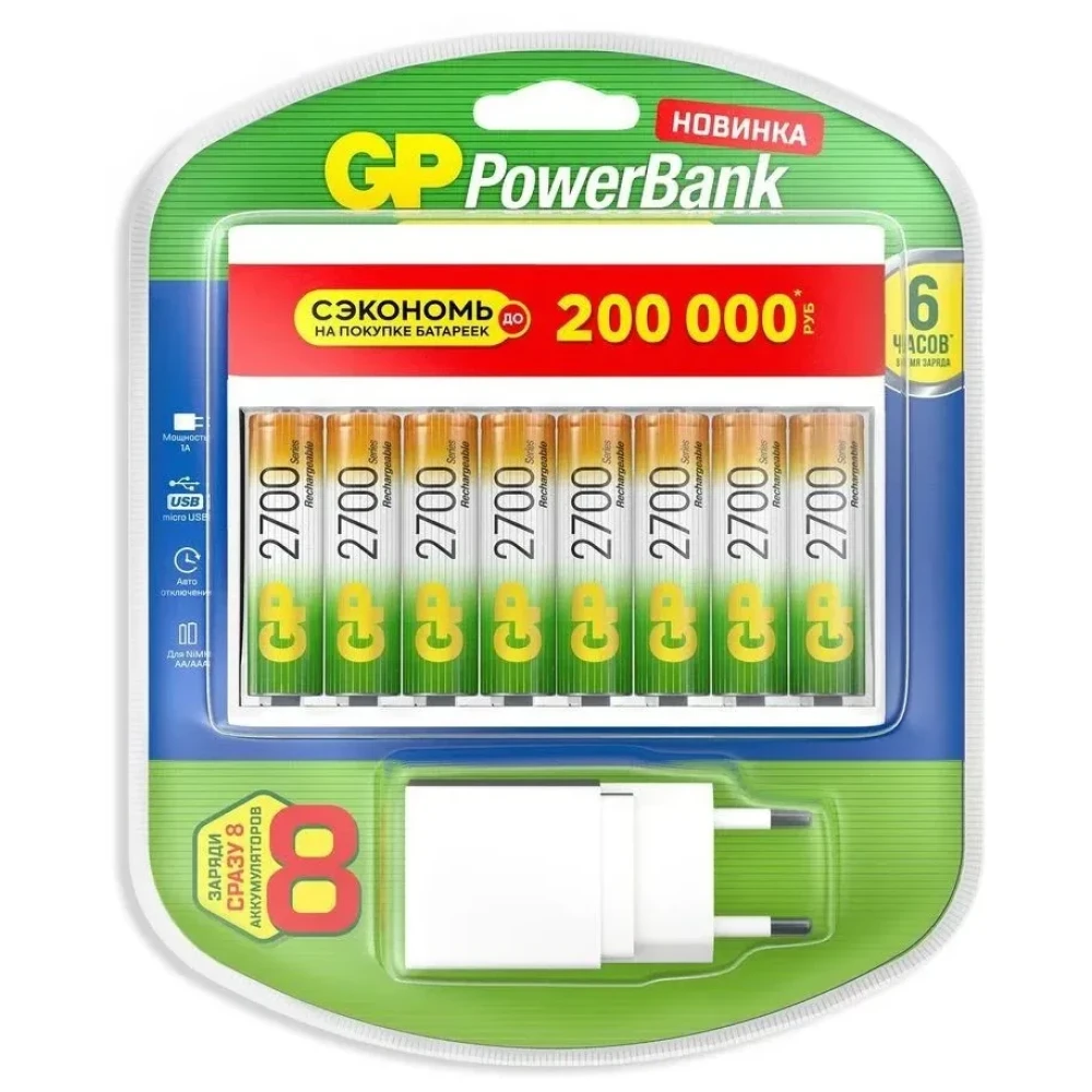 Зарядное устройство (12 ч.) + аккумулятор АА (HR6) 2700 мАч, 8 шт. + сетевой адаптер (GP 270AAHC/CPBXL-2CR8) работает везде, где есть USB. Универсальный USB-адаптер позволяет решать ваши задачи даже там, где нет розетки - например, в автомобиле или аэроэкспрессе.
